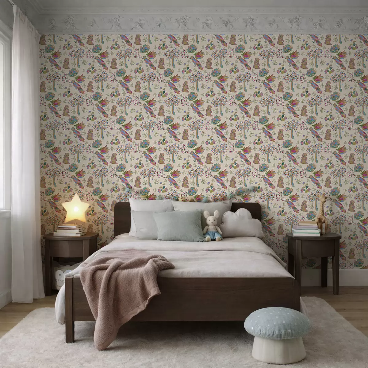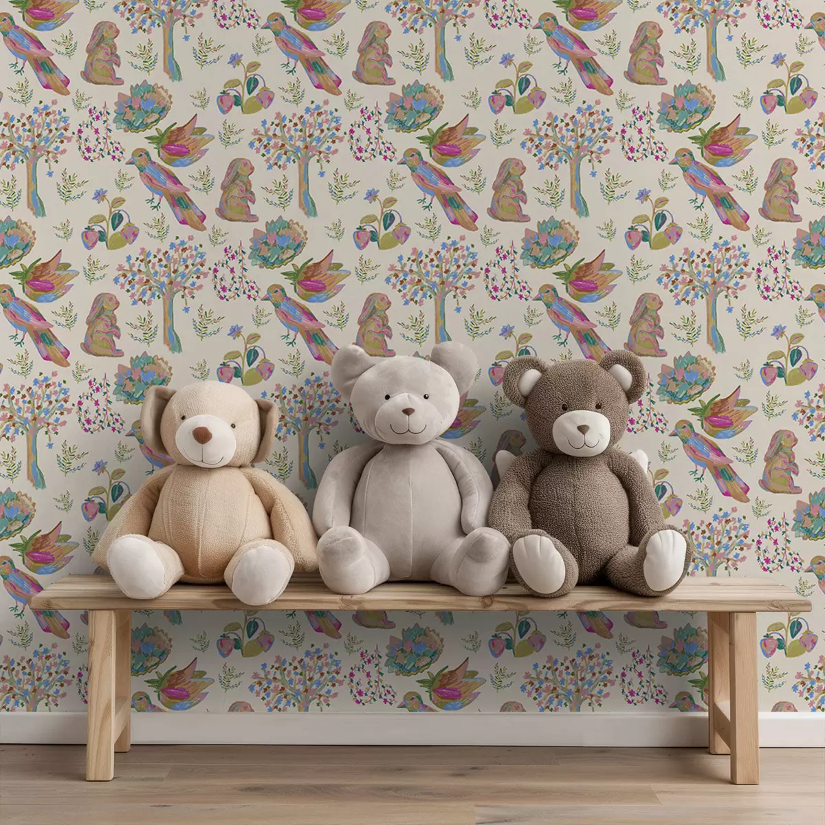 Papel pintado Colorido estampado infantil con pájaros y conejos. Nr. a01127