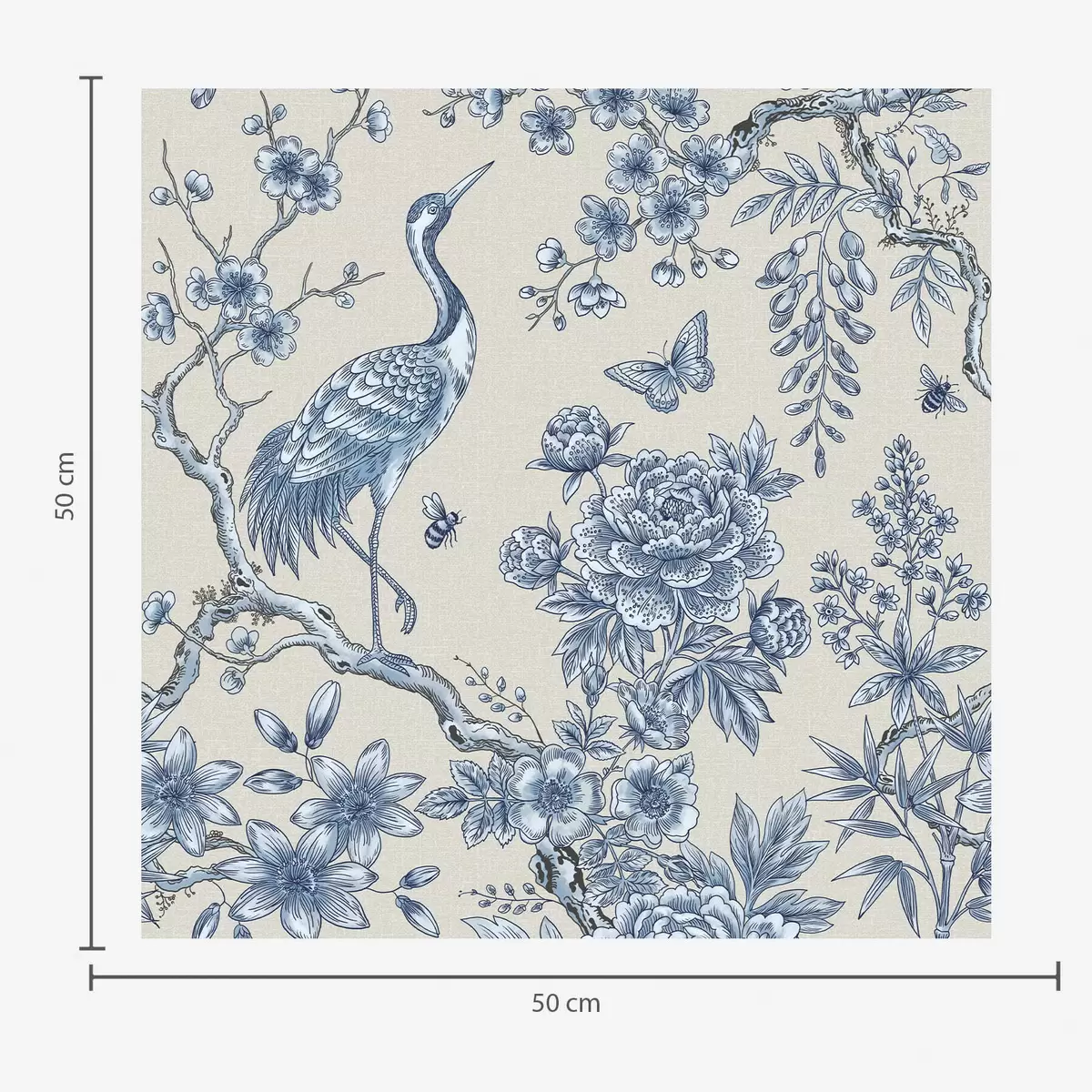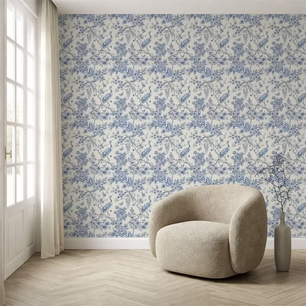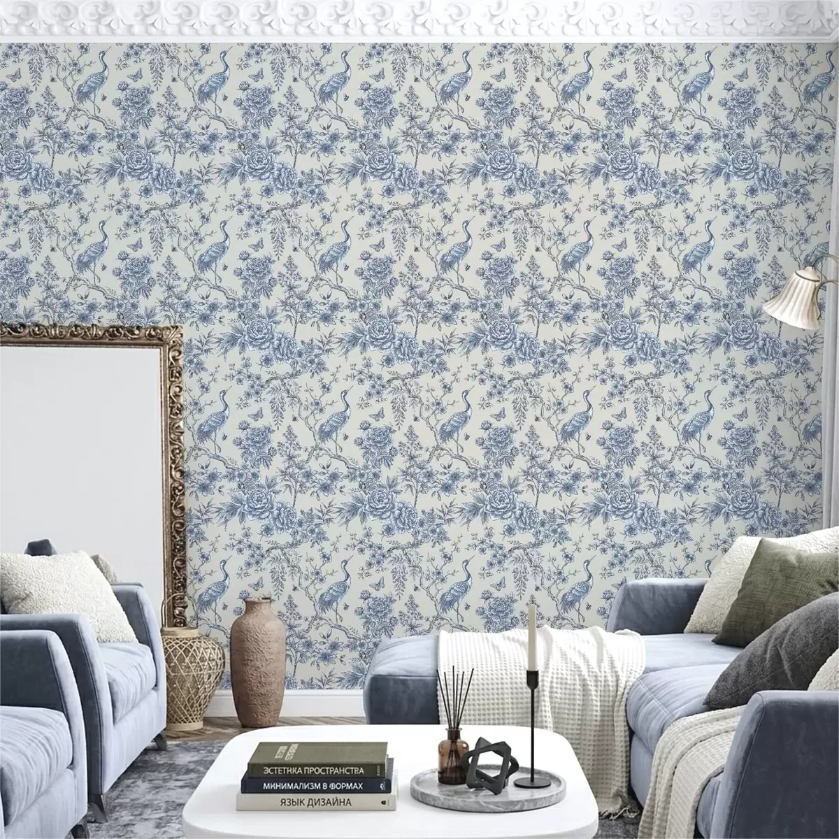 Papel pintado Adorno floral azul con un pájaro y ramas Nr. a01132