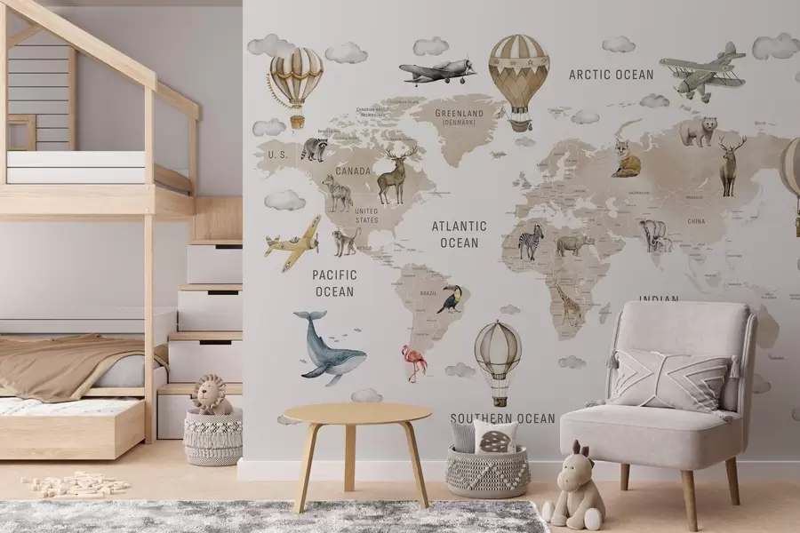 Mapamundi infantil con globos y animales