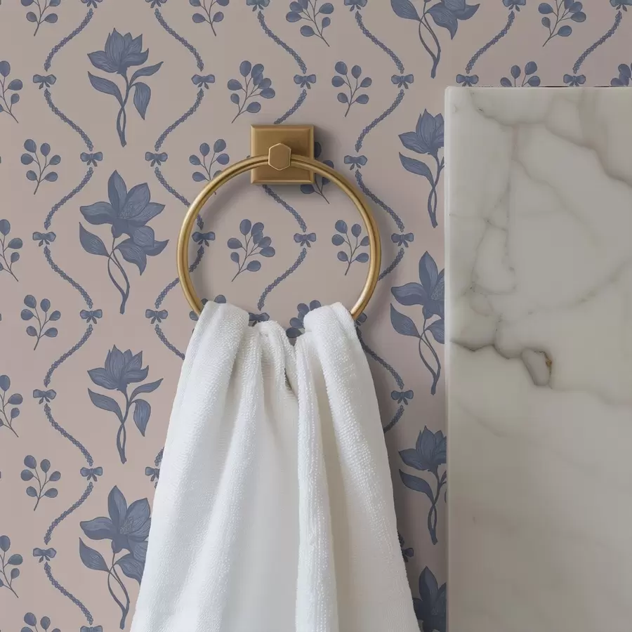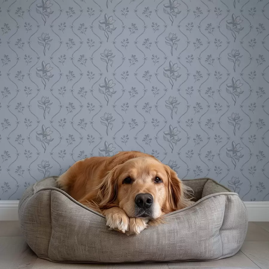 Flores estilizadas sobre un fondo gris azulado, paleta de colores fríos